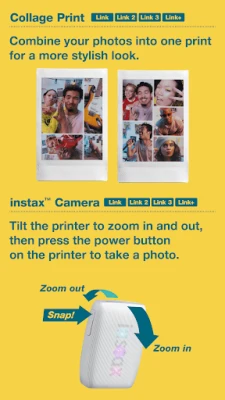ปลดล็อกโลกแห่งการพิมพ์ภาพถ่ายทันใจสุดสร้างสรรค์ด้วยแอป instax mini Link! เชื่อมต่อสมาร์ทโฟนของคุณเข้ากับเครื่องพิมพ์ instax mini Link ผ่านบลูทูธได้อย่างไร้รอยต่อ เปลี่ยนภาพความทรงจำในแกลเลอรีให้กลายเป็นภาพ instax ที่จับต้องได้ในพริบตา ไม่ว่าจะเป็นภาพถ่ายสวยๆ หรือช็อตเด็ดจากวิดีโอ คุณก็สามารถสั่งพิมพ์ได้อย่างง่ายดาย พร้อมเติมลูกเล่นให้ภาพถ่ายของคุณโดดเด่นไม่ซ้ำใครด้วยกรอบรูปสุดน่ารัก หรือสร้างสรรค์เรื่องราวการผจญภัยล่าสุดของคุณผ่านภาพคอลลาจที่ไม่เหมือนใคร รวบรวมช่วงเวลาโปรดมารวมไว้ในภาพเดียว