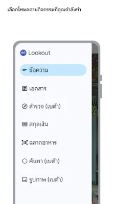 Lookout มาพร้อม 7 โหมดอัจฉริยะที่ออกแบบมาเพื่ออำนวยความสะดวกในชีวิตประจำวัน ไม่ว่าจะเป็นการอ่านป้ายสแกนข้อความบนเอกสารสำคัญ หรือแม้แต่จัดเรียงอีเมล โหมดข้อความและโหมดเอกสารจะช่วยให้คุณเข้าถึงข้อมูลตัวอักษรได้อย่างง่ายดาย โดยโหมดเอกสารยังรองรับภาษาได้มากกว่า 30 ภาษา ทั้งตัวพิมพ์และลายมือ สำหรับสิ่งที่อยู่รอบตัว โหมดสำรวจคือดวงตาคู่ใหม่ ที่สามารถระบุวัตถุ ผู้คน หรือข้อความในบริเวณใกล้เคียงได้อย่างชาญฉลาด และสำหรับการระบุธนบัตร โหมดสกุลเงินก็พร้อมให้ความแม่นยำและรวดเร็ว รองรับสกุลเงินหลักอย่างดอลลาร์สหรัฐ ยูโร และรูปีอินเดีย